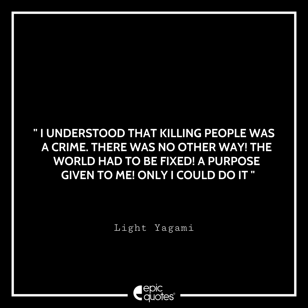 13 . I understood that killing people was a crime. There was no other way! The world had to be fixed! A purpose given to me! Only I could do it. -Light Yagami