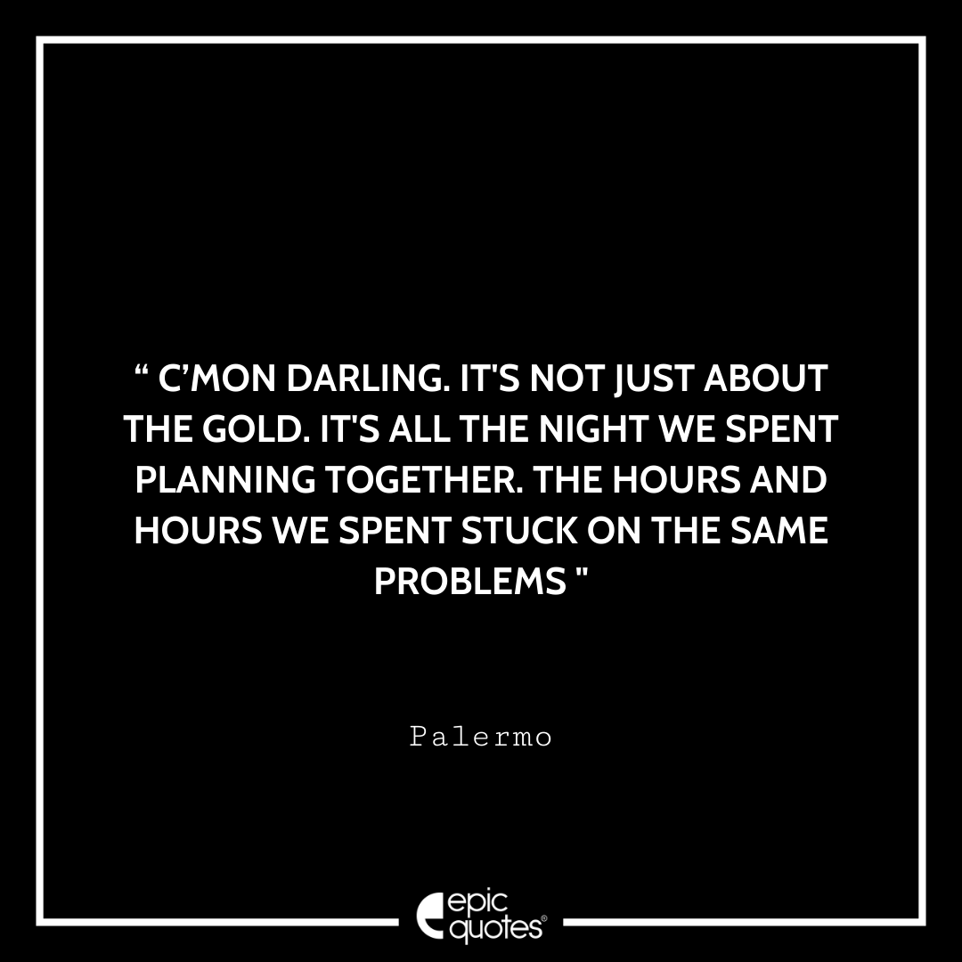 17 C’mon darling. It’s not just about the gold. It’s all the night we spent planning together. The hours and hours we spent stuck on the same problems. -Palermo