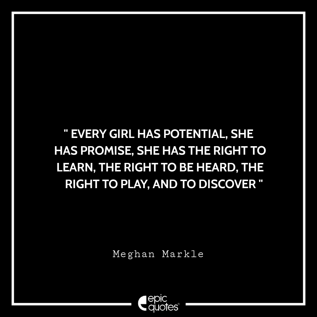 9 Every girl has potential, She has promise, She has the right to learn, the right to be heard, the right to play, and to discover. -Meghan Markle