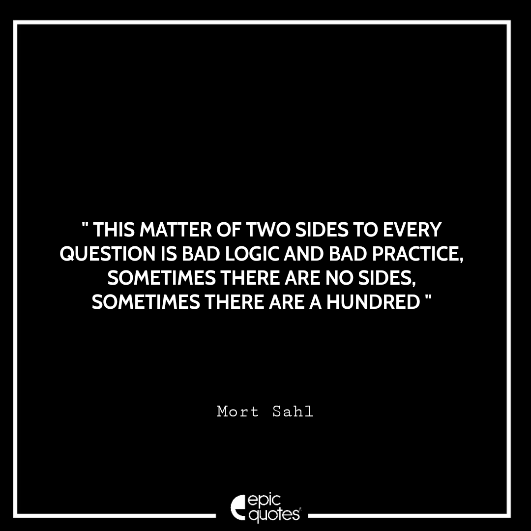1 This matter of two sides to every question is bad logic and bad practice, sometimes there are no sides; sometimes there are a hundred. -Mort Sahl