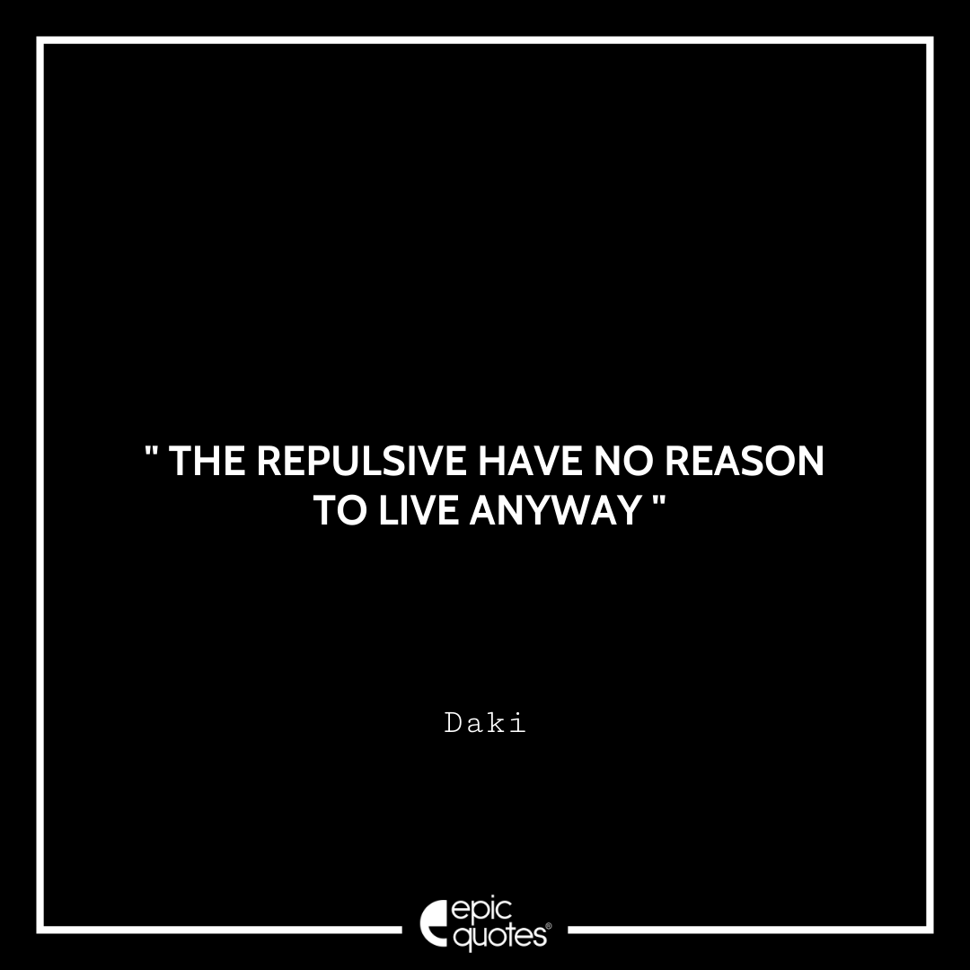 Daki is cruel. Human life holds no value to her and she would kill anyone she finds for fun. Even though this sounds as a motto she has, Daki has no morals and would kill anyone whom she thought of as loud or ugly.