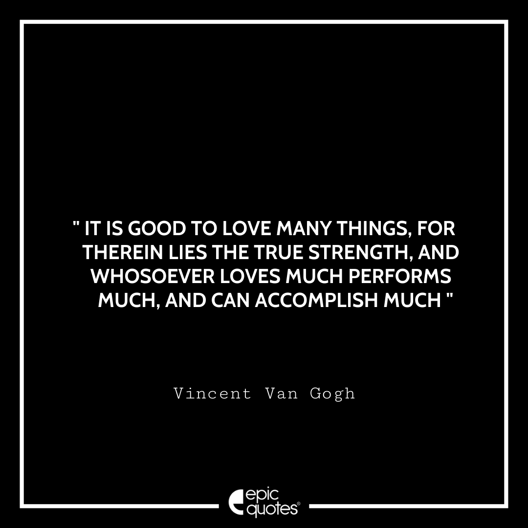 11. It is good to love many things, for therein lies the true strength, and whosoever loves much performs much, and can accomplish much. -Vincent Van Gogh
