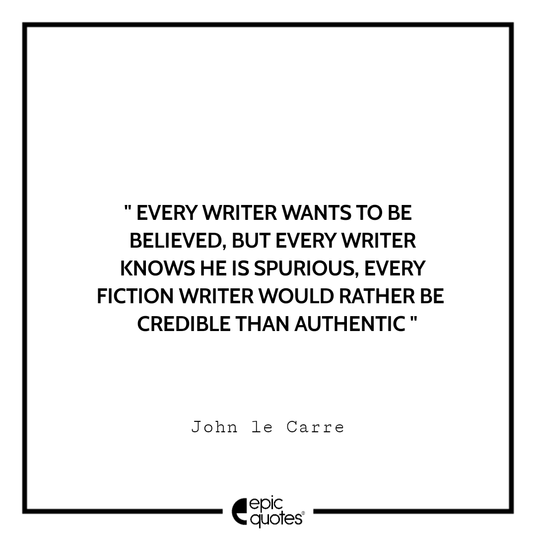 10 Every writer wants to be believed, but every writer knows he is spurious, every fiction writer would rather be credible than authentic. -John le Carre