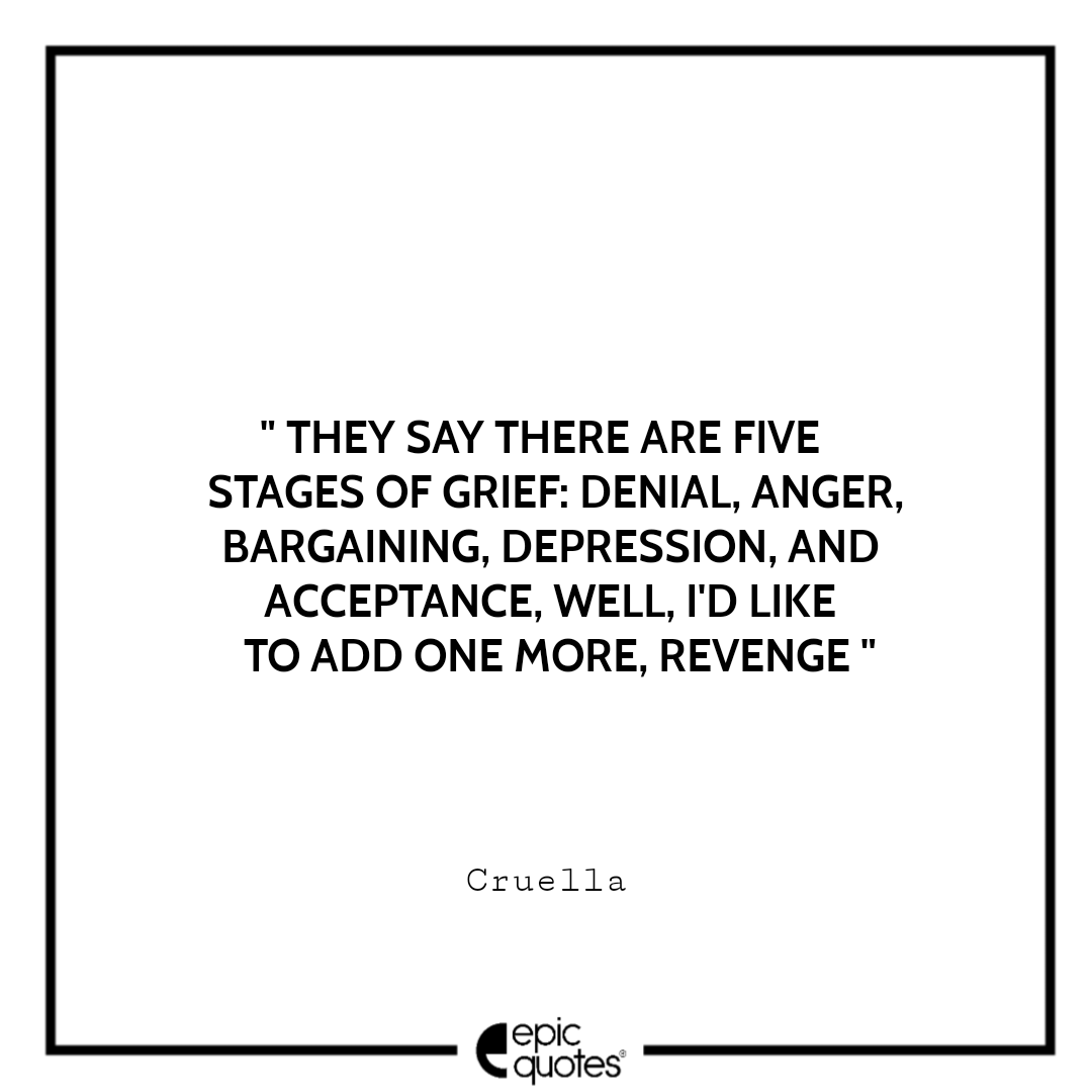 12 They say there are five stages of grief: Denial, anger, bargaining, depression, and acceptance, Well, I’d like to add one more, Revenge. -Cruella