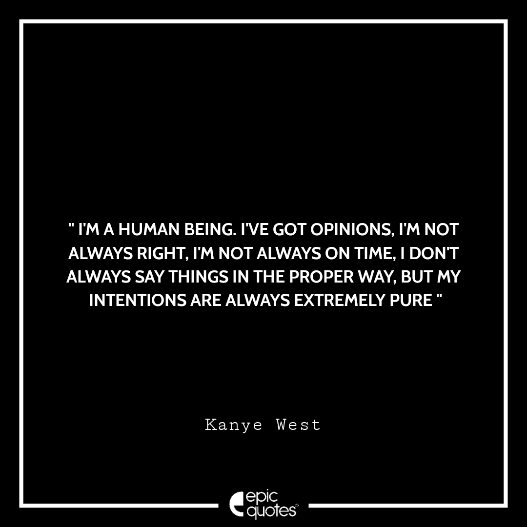12. I’m a human being. I’ve got opinions, I’m not always right, I’m not always on time, I don’t always say things in the proper way, but my intentions are always extremely pure. -Kanye West