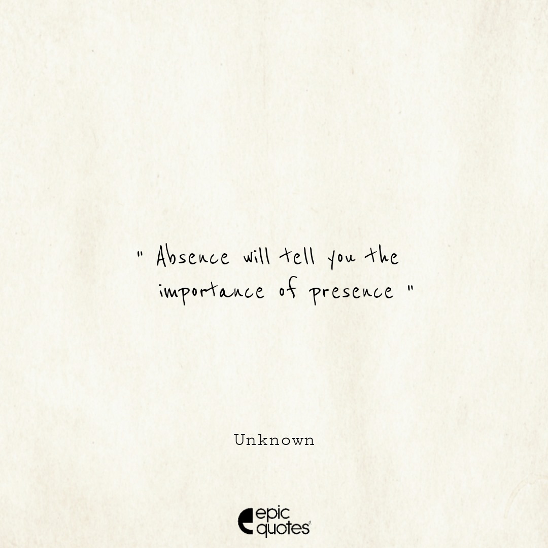 Categories Heartbreak UncategorizedAbsence will tell you the importance of presence Post author By Shubham Post date January 29, 2021 Absence will tell you the importance of presence” Absence will tell you the importance of presence “ Lets be social: 1.4M+ Fans 450K+ Followers ← They call us dreamers but we’re the ones who don’t sleep. → Length of days is not what makes age honourable, nor number of years the true measure of life. -Connell Waldron Related articles 10 Inspiring George W. Bush Quotes Of All Time! Let it hurt, Let it bleed, Let it heal, And let it go.” — Nikita Gill Don’t cry because it’s over, smile because it happened. –Dr. Seuss You will find that it is necessary to let things go; simply for the reason that they are heavy. -C. JoyBell Cry, Forgive, Learn, Move on, Let your tears water the seeds of your future happiness. –Steve Maraboli Nobody can go back and start a new beginning, but anyone can start today and make a new ending. –Maria Robinson