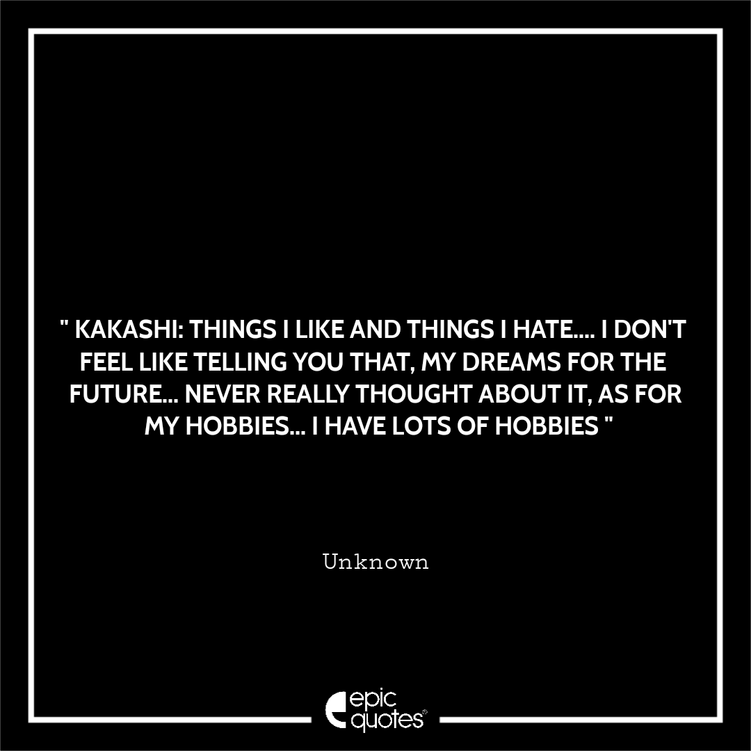 Kakashi: Things i like and things i hate.... I don't feel like telling you that. My dreams for the future... Never really thought about it. As for my hobbies... I have lots of hobbies. Categories Anime " Kakashi: Things i like and things i hate…. I don’t feel like telling you that. My dreams for the future… Never really thought about it. As for my hobbies… I have lots of hobbies. " Post author By Frady Lal Post date September 30, 2020