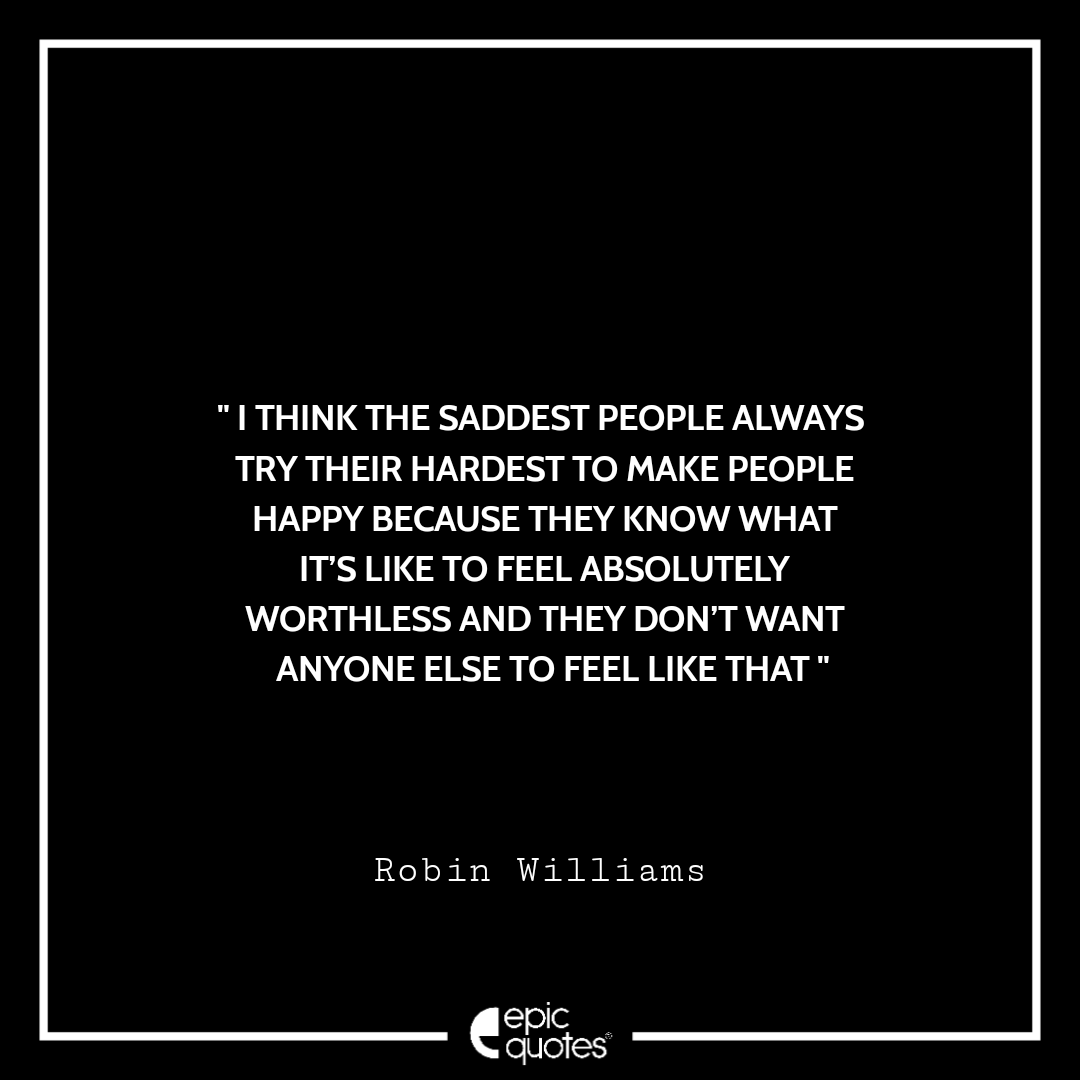 I think the saddest people always try their hardest to make people happy because they know what it’s like to feel absolutely worthless and they don’t want anyone else to feel like that. -Robin Williams Categories Authors & Celebrities Robin Williams " I think the saddest people always try their hardest to make people happy because they know what it’s like to feel absolutely worthless and they don’t want anyone else to feel like that. -Robin Williams " Post author By Frady Lal Post date August 3, 2020 Tags ROBIN WILLIAMS