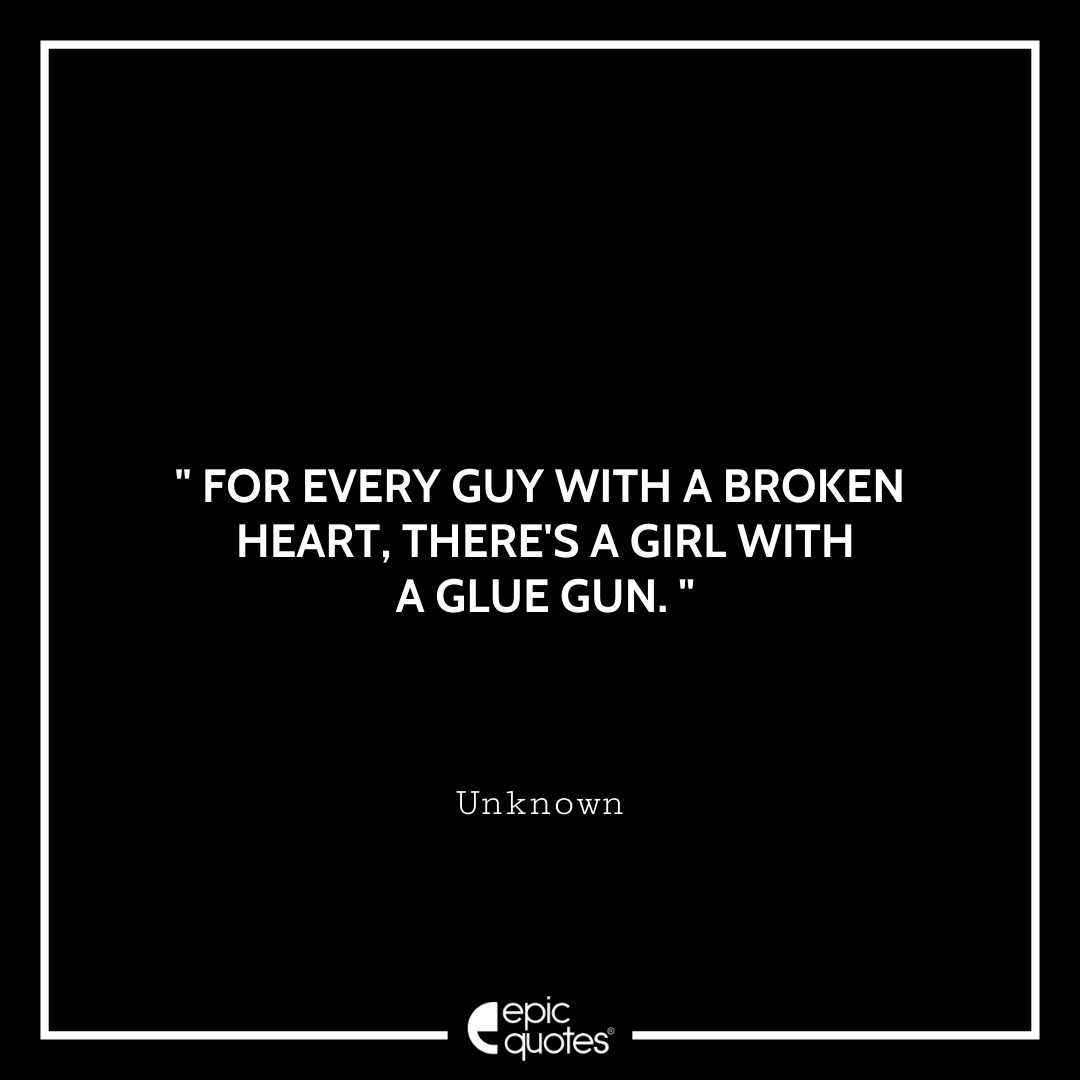 For every guy with a broken heart, there's a girl with a glue gun. Categories Epic Quotes Main " For every guy with a broken heart, there’s a girl with a glue gun. " Post author By Sanjay Dubey Post date March 1, 2022 Tags Epic Quotes, Funny Quotes, Inspiring, Life, Life Quotes, Love Quotes, quotes