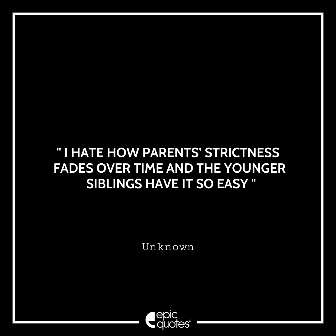 I hate how parents’ strictness fades over time and the younger siblings have it so easy Categories Epic Quotes Main " I hate how parents’ strictness fades over time and the younger siblings have it so easy. – Unknown " Post author By Sanjay Dubey Post date February 19, 2022 Tags Epic Quotes, Funny Quotes, Inspiring, Life, Life Quotes, Love Quotes, quotes