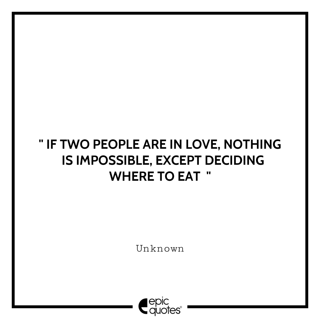 If two people are in love, nothing is impossible, except deciding where to eat Categories Epic Quotes Main " If two people are in love, nothing is impossible, except deciding where to eat " Post author By Tanya Suyal Post date January 21, 2022 Tags Epic Quotes, Funny Quotes, Inspiring, Life, Life Quotes, quotes