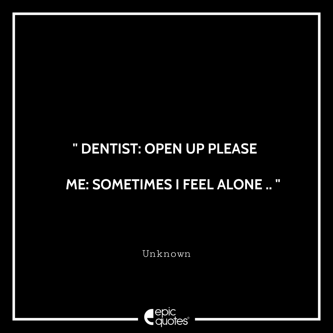 Dentist Open up please Me Sometimes I feel alone Categories Epic Quotes Main " Dentist Open up please Me Sometimes I feel alone " Post author By Tanya Suyal Post date January 23, 2022 Tags Epic Quotes, Funny Quotes, Inspiring, Life, Life Quotes, quotes