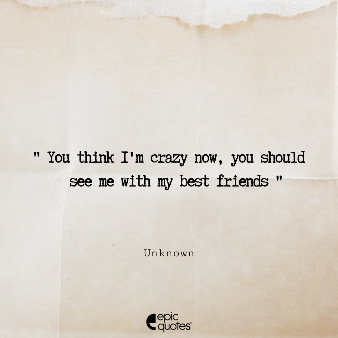 You think i'm crazy now, you should see me with my best friends. Categories Epic Quotes Main " You think I’m crazy now, you should see me with my best friends. " Post author By Tanya Suyal Post date January 28, 2022 Tags Epic Quotes, Funny Quotes, Inspiring, Life, Life Quotes, quotes
