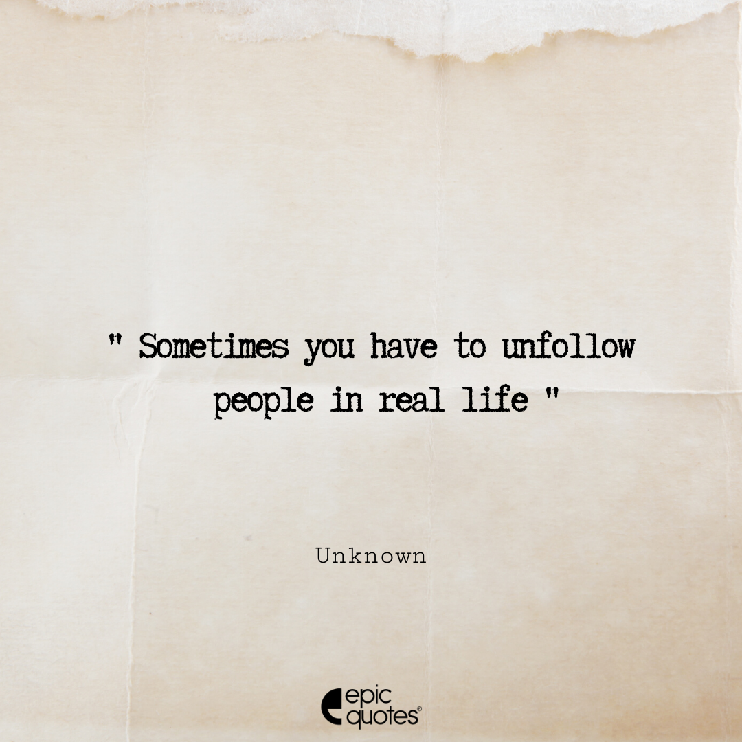 Sometimes you have to unfollow people in real life Categories Epic Quotes Main " Sometimes you have to unfollow people in real life " Post author By Tanya Suyal Post date January 31, 2022 Tags Epic Quotes, Funny Quotes, Inspiring, Life, Life Quotes, quotes