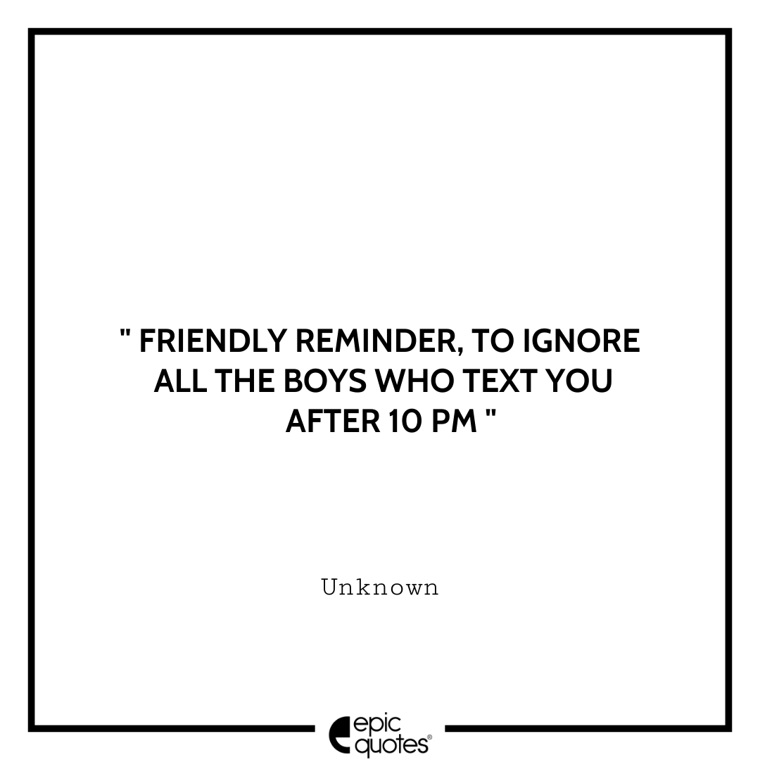 Friendly reminder, to ignore all the boys who text you after 10 pm Categories Epic Quotes Main " Friendly reminder, to ignore all the boys who text you after 10 pm " Post author By Tanya Suyal Post date February 5, 2022 Tags Epic Quotes, Funny Quotes, Inspiring, Life, Life Quotes, quotes