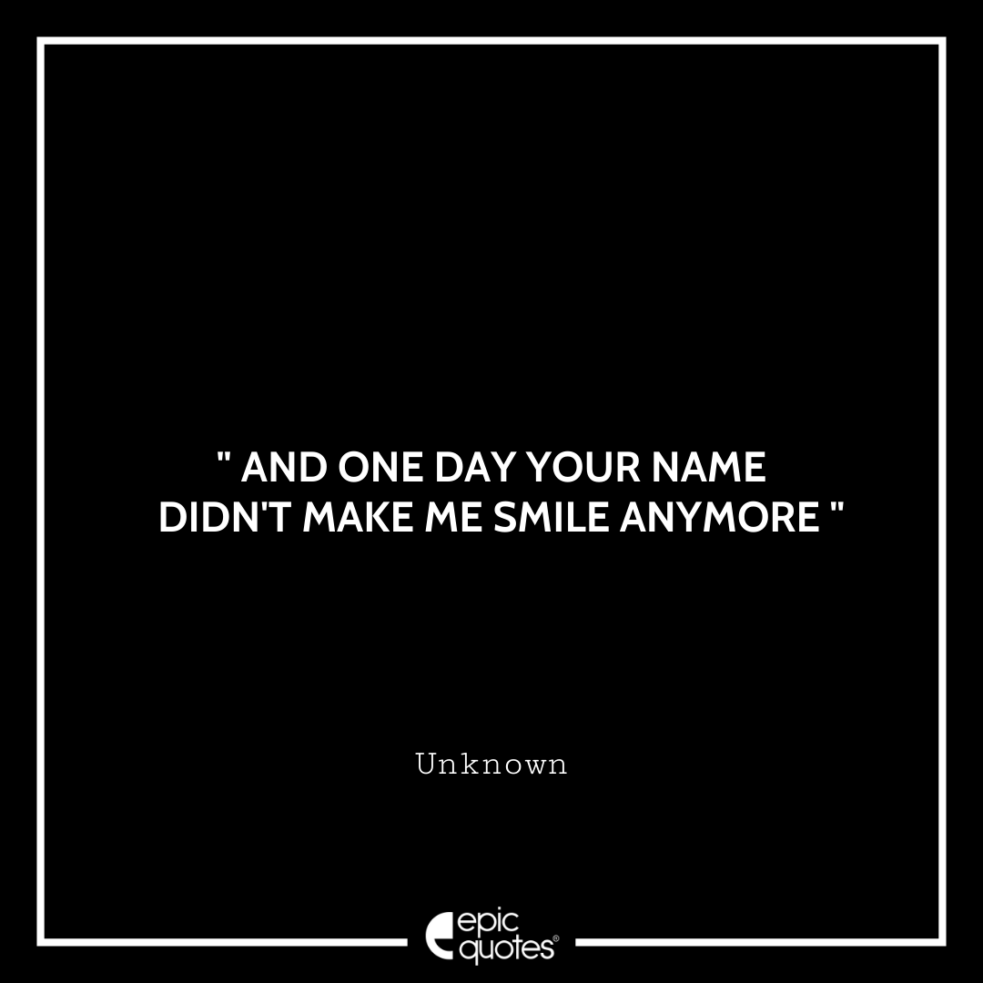 And one day your name didn't make me smile anymore Categories Epic Quotes Main " And one day your name didn’t make me smile anymore " Post author By Tanya Suyal Post date February 7, 2022 Tags Epic Quotes, Funny Quotes, Inspiring, Life, Life Quotes, quotes