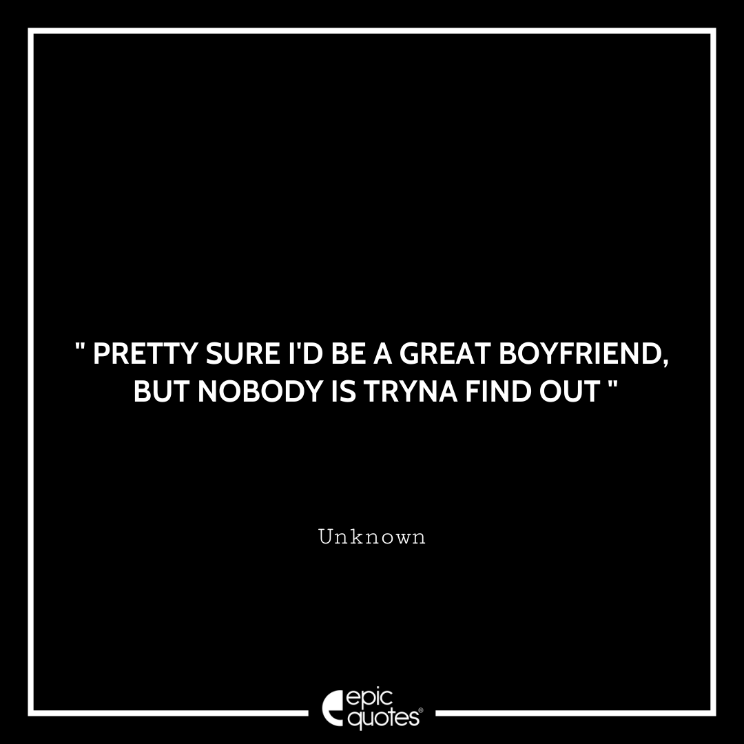 Pretty sure I'd be a great boyfriend, but nobody is tryna find out Categories Epic Quotes Main " Pretty sure I’d be a great boyfriend, but nobody is tryna find out " Post author By Tanya Suyal Post date February 1, 2022 Tags Epic Quotes, Funny Quotes, Inspiring, Life, Life Quotes, quotes