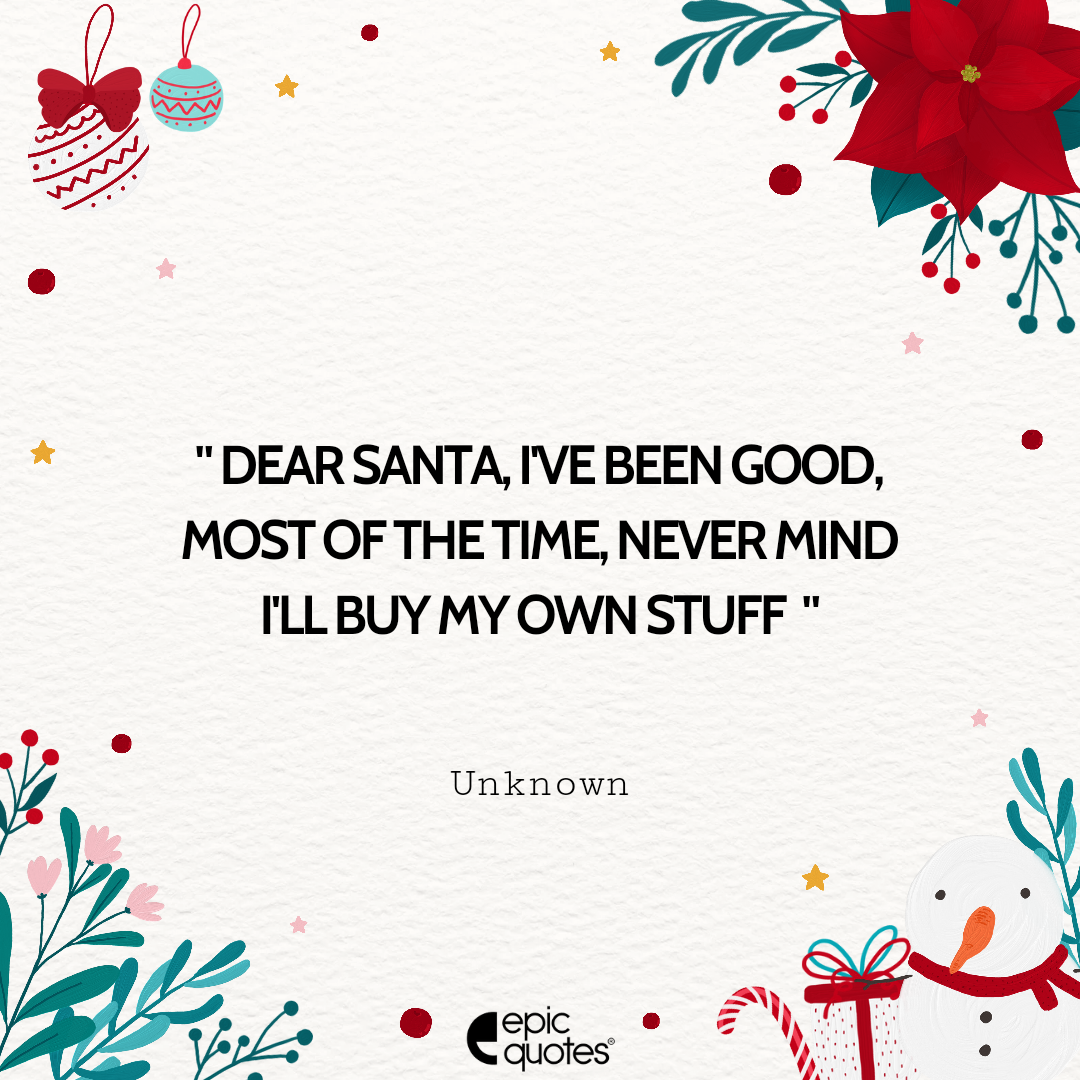 Dear Santa, I've been good, most of the time, never mind I'll buy my own stuff Categories Epic Quotes Main " Dear Santa, I’ve been good, most of the time, never mind I’ll buy my own stuff " Post author By Tanya Suyal Post date December 25, 2021 Tags Epic Quotes, Funny Quotes, Inspiring, Life, Life Quotes, quotes