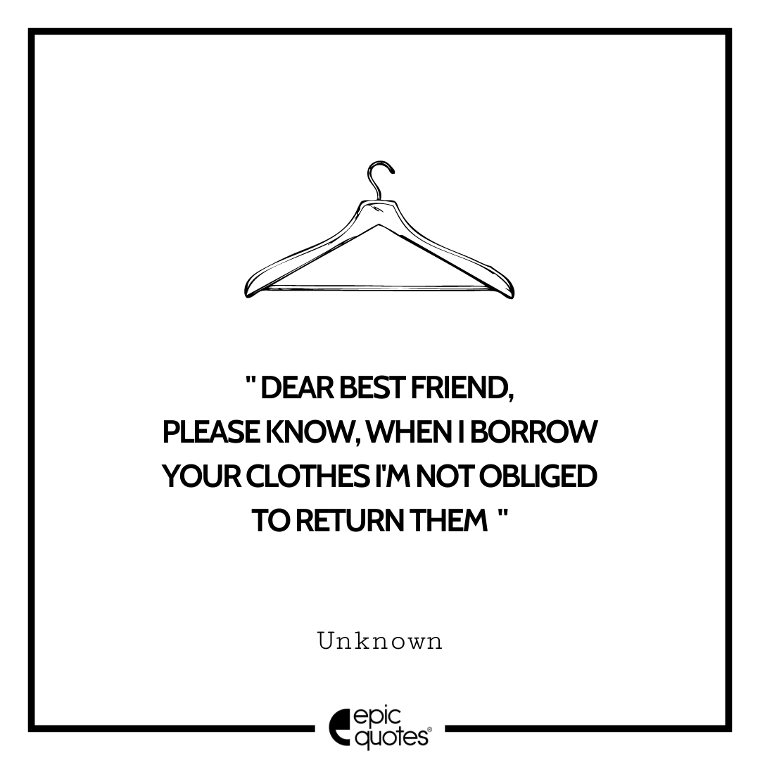 Dear best friend, Please know, when I borrow your clothes I'm not obliged to return them Categories Epic Quotes Main " Dear Best Friend, Please know, When I Borrow Your Clothes I’m not Obliged to Return Them " Post author By Tanya Suyal Post date December 19, 2021 Tags Epic Quotes, Funny Quotes, Inspiring, Life, Life Quotes, quotes