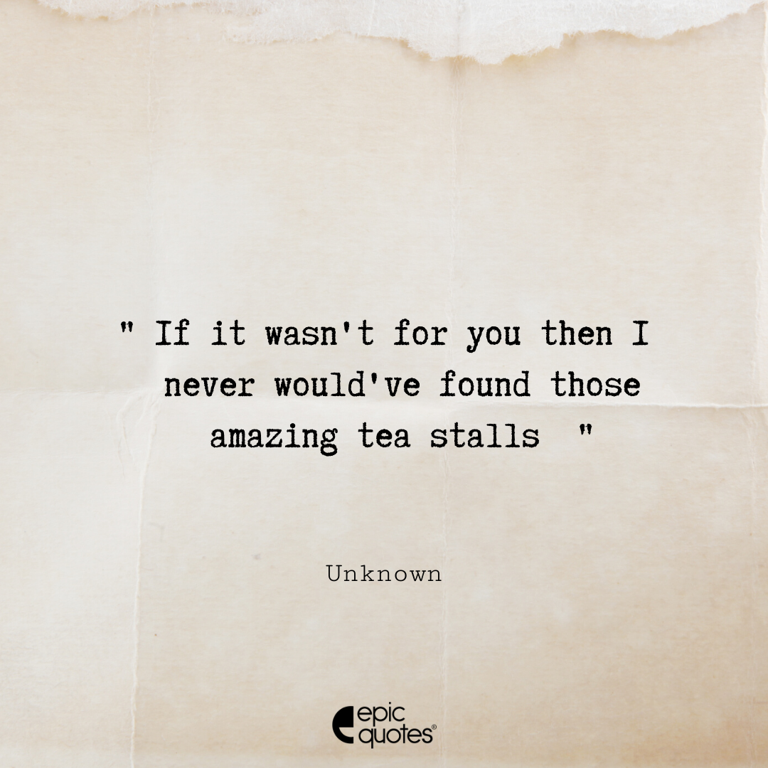 If it wasn't for you then I never would've found those amazing tea stalls Categories Epic Quotes Main " If it wasn’t for you then I never would’ve found those amazing tea stalls " Post author By Tanya Suyal Post date December 20, 2021 Tags Epic Quotes, Funny Quotes, Inspiring, Life, Life Quotes, quotes