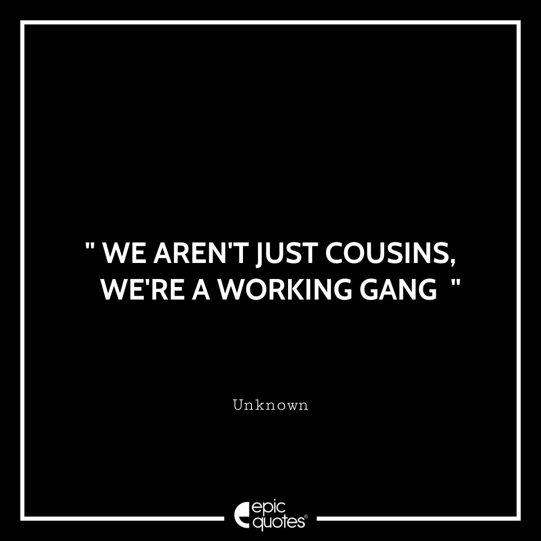 We aren't just cousins, we're a working Gang Categories Epic Quotes Main " We aren’t just cousins, we’re a working Gang " Post author By Tanya Suyal Post date December 28, 2021 Tags Epic Quotes, Funny Quotes, Inspiring, Life, Life Quotes, quotes