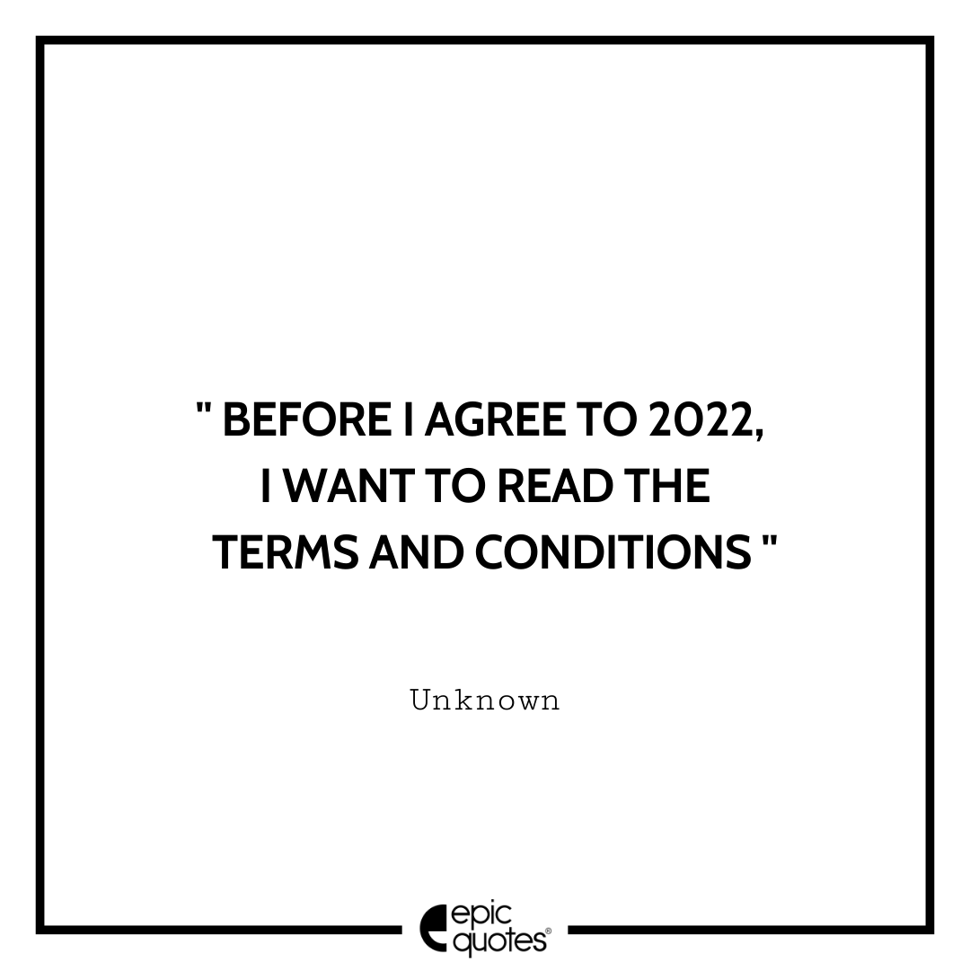 Before I agree to 2022, I want to read the terms and conditions Categories Epic Quotes Main " Before I agree to 2022, I want to read the terms and conditions " Post author By Tanya Suyal Post date December 31, 2021 Tags Epic Quotes, Funny Quotes, Inspiring, Life, Life Quotes, quotes