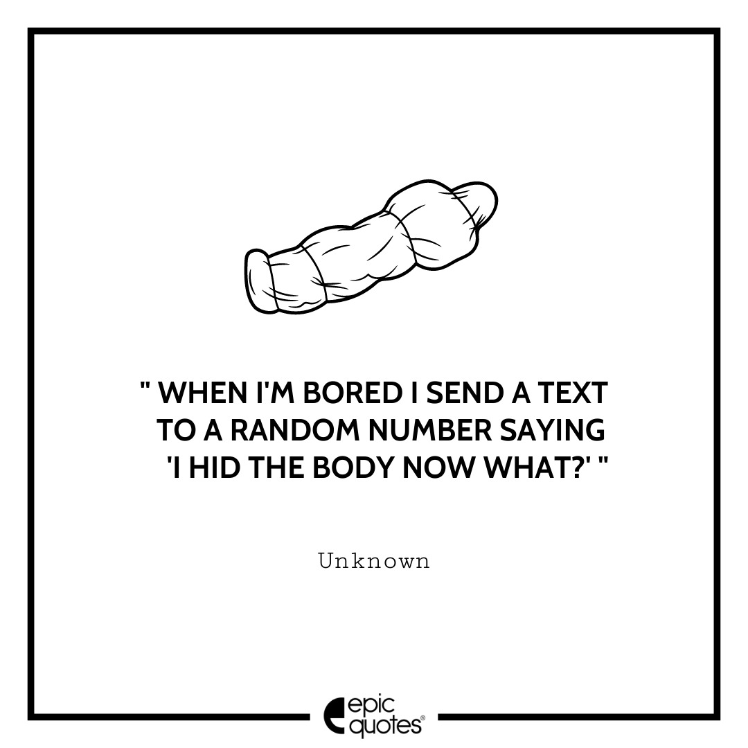 When I'm bored I send a text to a random number saying 'I hid the body now what?' Categories Epic Quotes Main " When I’m bored I send a text to a random number saying ‘I hid the body now what?’ " Post author By Tanya Suyal Post date January 2, 2022 Tags Epic Quotes, Funny Quotes, Inspiring, Life, Life Quotes, quotes