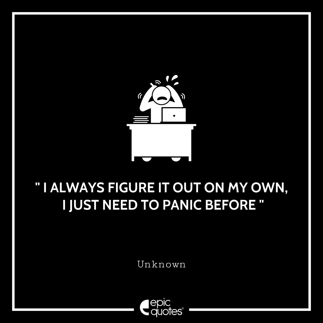 I always figure it out on my own, I just need to panic before Categories Epic Quotes Main " I Always Figure it out on my own, I Just Need to Panic Before " Post author By Tanya Suyal Post date November 24, 2021 Tags Epic Quotes, Funny Quotes, Inspiring, Life, Life Quotes, quotes