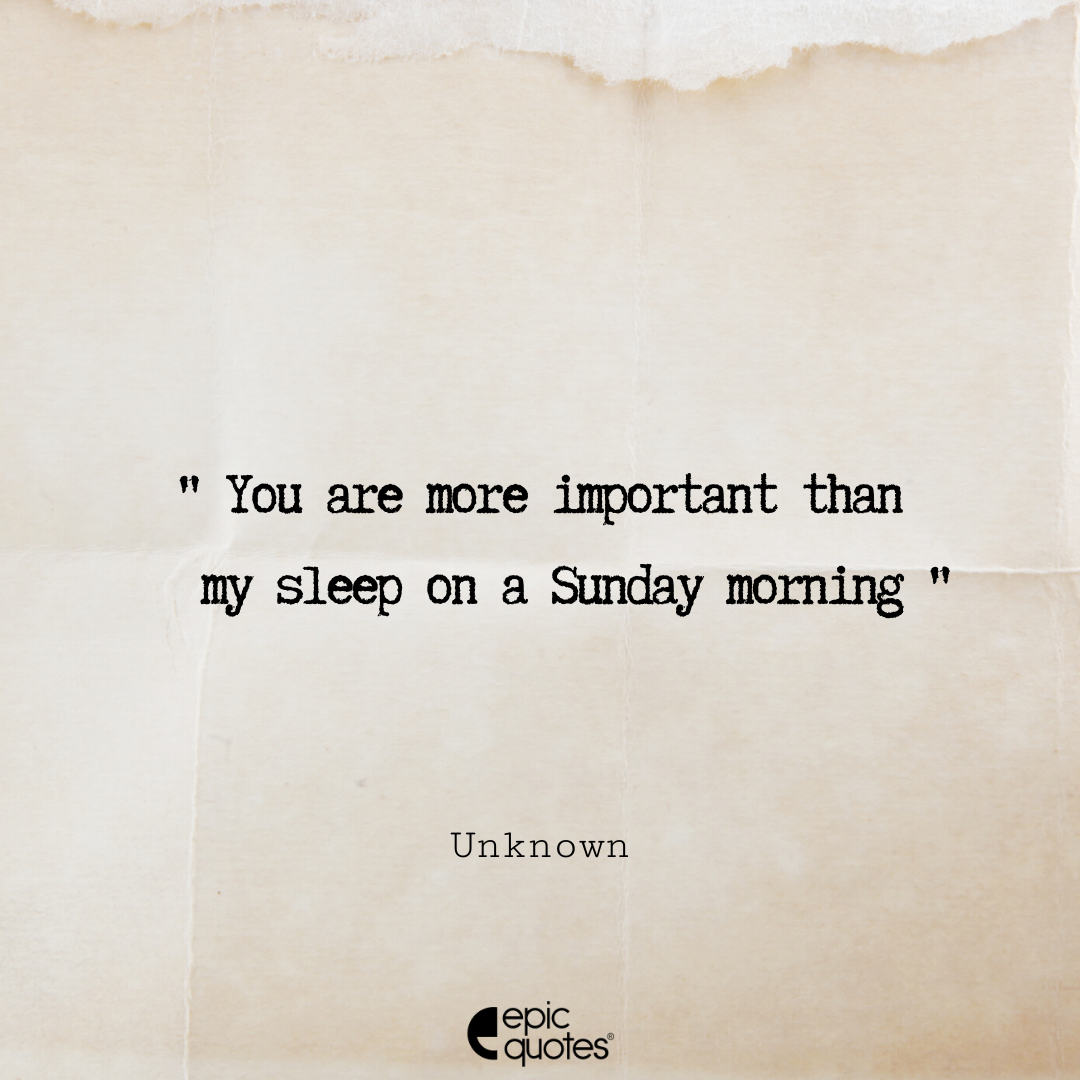 You are more important than my sleep on a Sunday morning. Categories Epic Quotes Main " You are More Important than My Sleep on a Sunday Morning " Post author By Tanya Suyal Post date November 20, 2021 Tags Epic Quotes, Funny Quotes, Inspiring, Life, Life Quotes, quotes