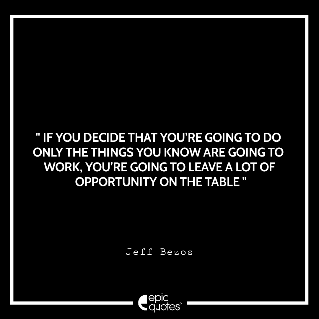 If you decide that you’re going to do only the things you know are going to work, you’re going to leave a lot of opportunity on the table Categories Jeff Bezos " If you decide that you’re going to do only the things you know are going to work, you’re going to leave a lot of opportunity on the table " Post author By Shubham Post date April 1, 2022