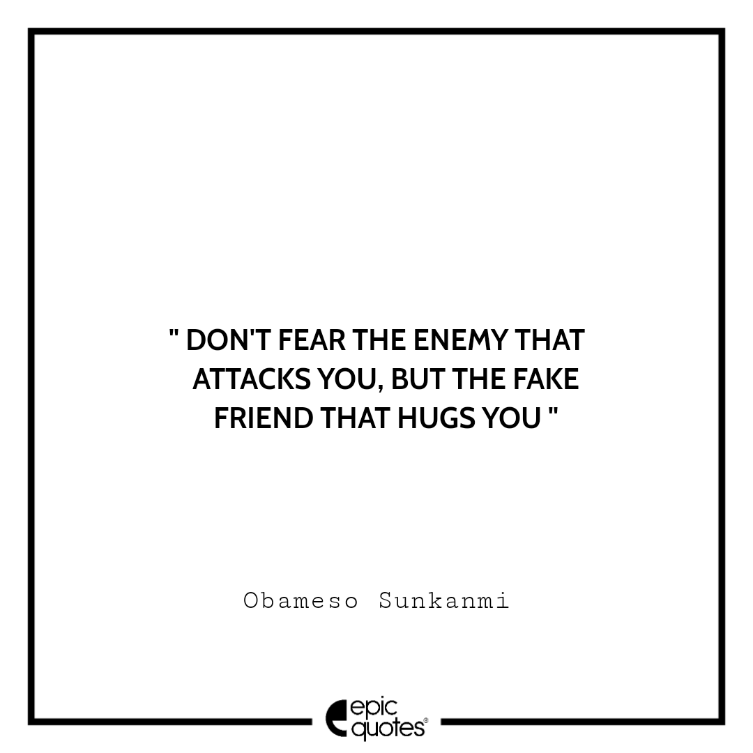 Categories LifeDon’t fear the enemy that attacks you, but the fake friend that hugs you. Obameso Sunkanmi Post author By Frady Lal Post date August 21, 2020 ” Don’t fear the enemy that attacks you, but the fake friend that hugs you. Obameso Sunkanmi “ Lets be social: 1.4M+ Fans 450K+ Followers ← Ricky, remember: The field mouse is fast, but the owl sees at night. — Chip → A day without laughter is a day wasted. – Charlie Chaplin Related articles I call myself an overthinker and still make the wrong decisions Silence is not empty, it is the loudest answer People say life goes on, and I think that’s the saddest part Some people come into your life just to teach you how to let go. The past is a place of reference, not a place of residence. A start is what stops people.