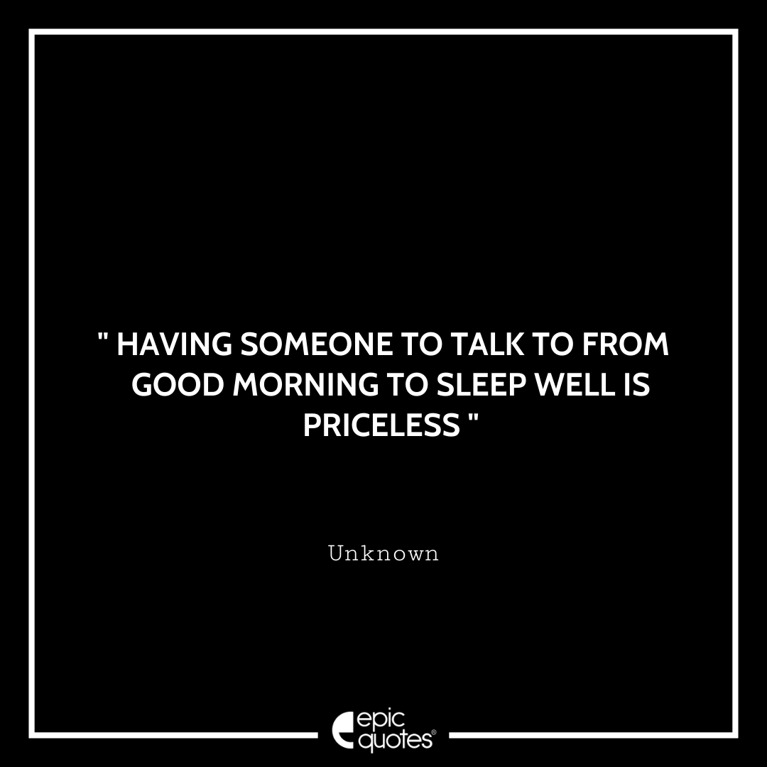 Categories Epic Quotes MainHaving someone to talk to from good morning to sleep well is priceless Post author By Tanya Suyal Post date April 8, 2022 Having someone to talk to from good morning to sleep well is priceless” Having someone to talk to from good morning to sleep well is priceless “ Lets be social: 1.4M+ Fans 450K+ Followers Tags Epic Quotes, Funny Quotes, Inspiring, Life, Life Quotes, quotes ← 13 Best Joel Osten Quotes About LIfe And Success → Luck Finding a best friend with the same derangement Related articles Sorry I’m Late, I was Hoping the Plan Would be Canceled Don’t cry over what has happened; great things are ahead Kindle, paperbacks, or do you not read at all? Is it just me or does everyone have a second dinner? What’s your first thought every morning after waking up? I miss my lost friendships more than anything else