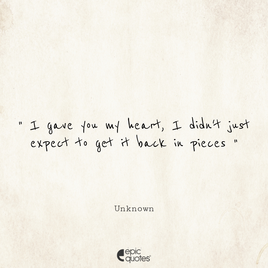 Categories HeartbreakI gave you my heart I didn’t just expect to get it back in pieces. Post author By Chirag Malik Post date January 6, 2020 I gave you my heart I didn't just expect to get it back in pieces.” I gave you my heart I didn’t just expect to get it back in pieces. “ Lets be social: 1.4M+ Fans 450K+ Followers Chirag MalikMeet Mr Sarcasm, always giving advice – taking none, a wannabe engineer and a bonafide curator who’s full of quirks! Ps : No one really listens to him though ;)Connect with me:[email protected] View Posts → ← My motto is to sleep till I feel better → I don’t know why they call it heartbreak, it feels like every other part of my body is broken too. Related articles Cry, Forgive, Learn, Move on, Let your tears water the seeds of your future happiness. –Steve Maraboli Nobody can go back and start a new beginning, but anyone can start today and make a new ending. –Maria Robinson Sometimes you have to move on without certain people, if they’re meant to be in your life, they’ll catch up. –Mandy Hale What a beautiful thing it is, to stand tall and say, I fell apart and I survived. -Unknown The pain is an opportunity to resurrect our true selves. Sometimes when you are in a dark place, you think you’ve been buried; but actually you’ve been planted.