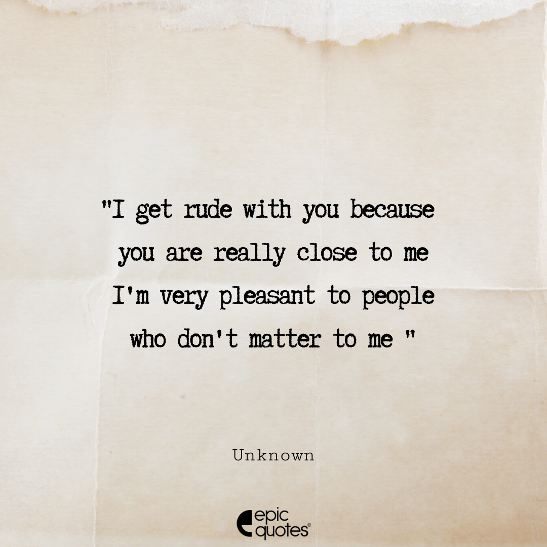 Categories Epic Quotes Main LoveI get rude with you because you are really close to me. I’m very pleasant to people who don’t matter to me Post author By Sanjay Dubey Post date November 2, 2021 I get rude with you because you are really close to me. I'm very pleasant to people who don't matter to me” I get rude with you because you are really close to me. I’m very pleasant to people who don’t matter to me “ Lets be social: 1.4M+ Fans 450K+ Followers Tags Epic Quotes, Life, Life Quotes, Love Quotes, Quote of the day, quotes ← And every time you’re alone, maybe you’re not…. what was your scariest encounter with the supernatural → 10 Most Heartwarming Quotes By David Schwimmer Related articles Sorry I’m Late, I was Hoping the Plan Would be Canceled Don’t cry over what has happened; great things are ahead Kindle, paperbacks, or do you not read at all? Is it just me or does everyone have a second dinner? What’s your first thought every morning after waking up? I miss my lost friendships more than anything else