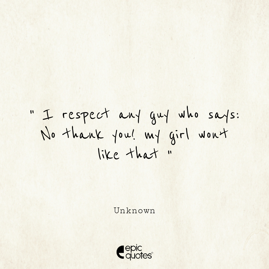 Categories Epic Quotes MainI respect any guy who says: No thank you! my girl won’t like that Post author By Chirag Malik Post date May 17, 2020 I respect any guy who says: No thank you! my girl won’t like that” I respect any guy who says: No thank you! my girl won’t like that “ Lets be social: 1.4M+ Fans 450K+ Followers Chirag MalikMeet Mr Sarcasm, always giving advice – taking none, a wannabe engineer and a bonafide curator who’s full of quirks! Ps : No one really listens to him though ;)Connect with me:[email protected] View Posts → ← So much on my mind but no one to talk to → One person – thousand feelings Related articles Sorry I’m Late, I was Hoping the Plan Would be Canceled Don’t cry over what has happened; great things are ahead Kindle, paperbacks, or do you not read at all? Is it just me or does everyone have a second dinner? What’s your first thought every morning after waking up? I miss my lost friendships more than anything else