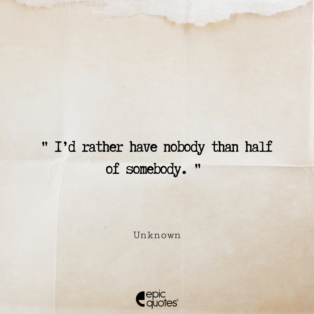 Categories Epic Quotes MainI’d rather have nobody than half of somebody Post author By Tanya Suyal Post date August 21, 2022 I’d rather have nobody than half of somebody” I’d rather have nobody than half of somebody “ Lets be social: 1.4M+ Fans 450K+ Followers Tags Epic Quotes, Funny Quotes, Inspiring, Life, Life Quotes, quotes ← YOU CAN BE A GOOD PERSON WITH A KIND HEART AND STILL SAY NO → I WANNA SLEEP FOR A WEEK Related articles Sorry I’m Late, I was Hoping the Plan Would be Canceled Don’t cry over what has happened; great things are ahead Kindle, paperbacks, or do you not read at all? Is it just me or does everyone have a second dinner? What’s your first thought every morning after waking up? I miss my lost friendships more than anything else