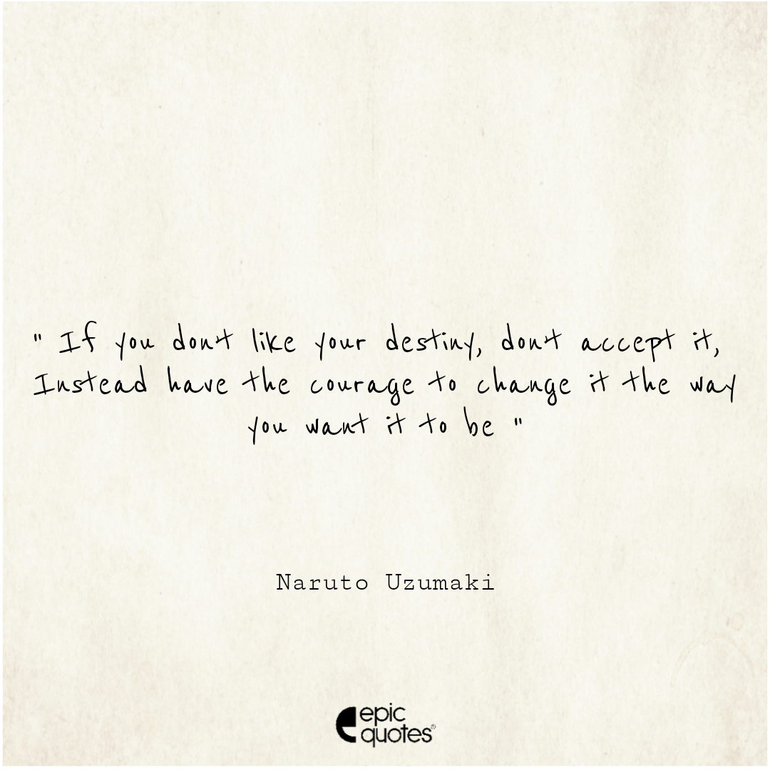 Categories AnimeIf you don’t like your destiny, don’t accept it. Instead have the courage to change it the way you want it to be Post author By Frady Lal Post date September 6, 2020 If you don’t like your destiny, don’t accept it. Instead have the courage to change it the way you want it to be” If you don’t like your destiny, don’t accept it. Instead have the courage to change it the way you want it to be “ Lets be social: 1.4M+ Fans 450K+ Followers ← I don’t like the trappings of stardom. I wear the shoes and the Dolce & Gabbana, because I’m told to. But I’m not trapped by it → Even I can tell that hatred is spreading. I wanted to do something about it…but I don’t know what. I believe… that someday the day will come when people truly understand one another! Related articles Even if you regret something and get depressed, nothing will change, did you know that? -Nejire Hado A goal with no plan is called a delusion, You need a plan in order to achieve your goal. -Overhaul When you’re really scared, When your life is really on the line, Your true colors show. -Red Riot It’s through my actions that I’ll realize my dreams. -Shoto Todoroki Remember why you started down this path, and let that memory carry you beyond your limit. –All Might There’s nothing crueler than letting a dream end midway. –Shouta Aizawa