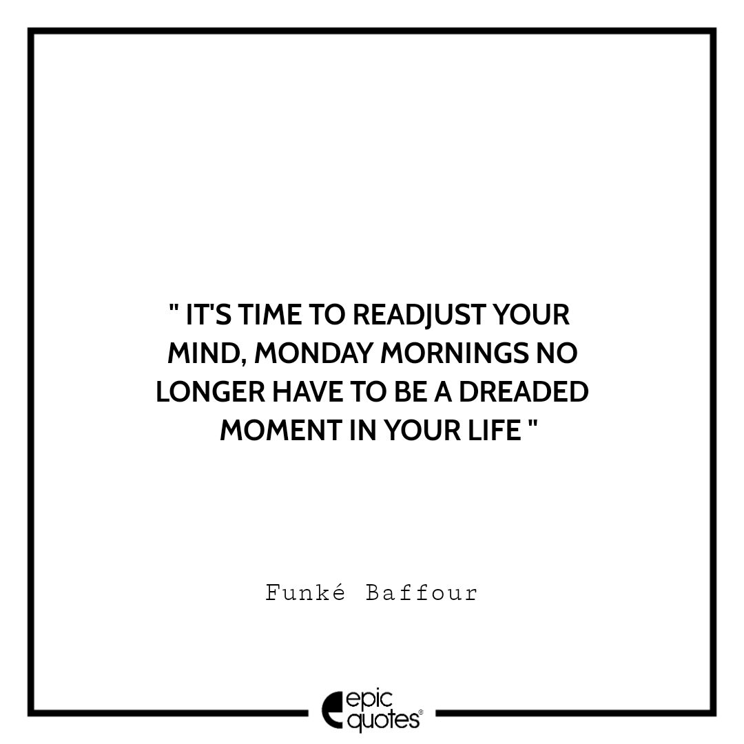Categories MondayIt’s time to readjust your mind, Monday mornings no longer have to be a dreaded moment in your life. -Funké Baffour Post author By Shubham Post date March 31, 2022 It's time to readjust your mind, Monday mornings no longer have to be a dreaded moment in your life. -Funké Baffour” It’s time to readjust your mind, Monday mornings no longer have to be a dreaded moment in your life. -Funké Baffour “ Lets be social: 1.4M+ Fans 450K+ Followers ← I said that the issue is not Monday, the issue is action without motivation. -Denny Dey → Every day is different, and some days are better than others, but no matter how challenging the day, I get up and live it. -Muhammad Ali Related articles Nothing will work unless you do. –Maya Angelou It’s not knowing what to do, it’s doing what you know. –Tony Robbins Too many of us are not living our dreams because we are living our fears. –Les Brown Let no feeling of discouragement prey upon you, and in the end you are sure to succeed. –Abraham Lincoln Knowing trees, I understand the meaning of patience. Knowing grass, I can appreciate persistence. –Hal Borland The way to get started is to quit talking and begin doing. –Walt Disney