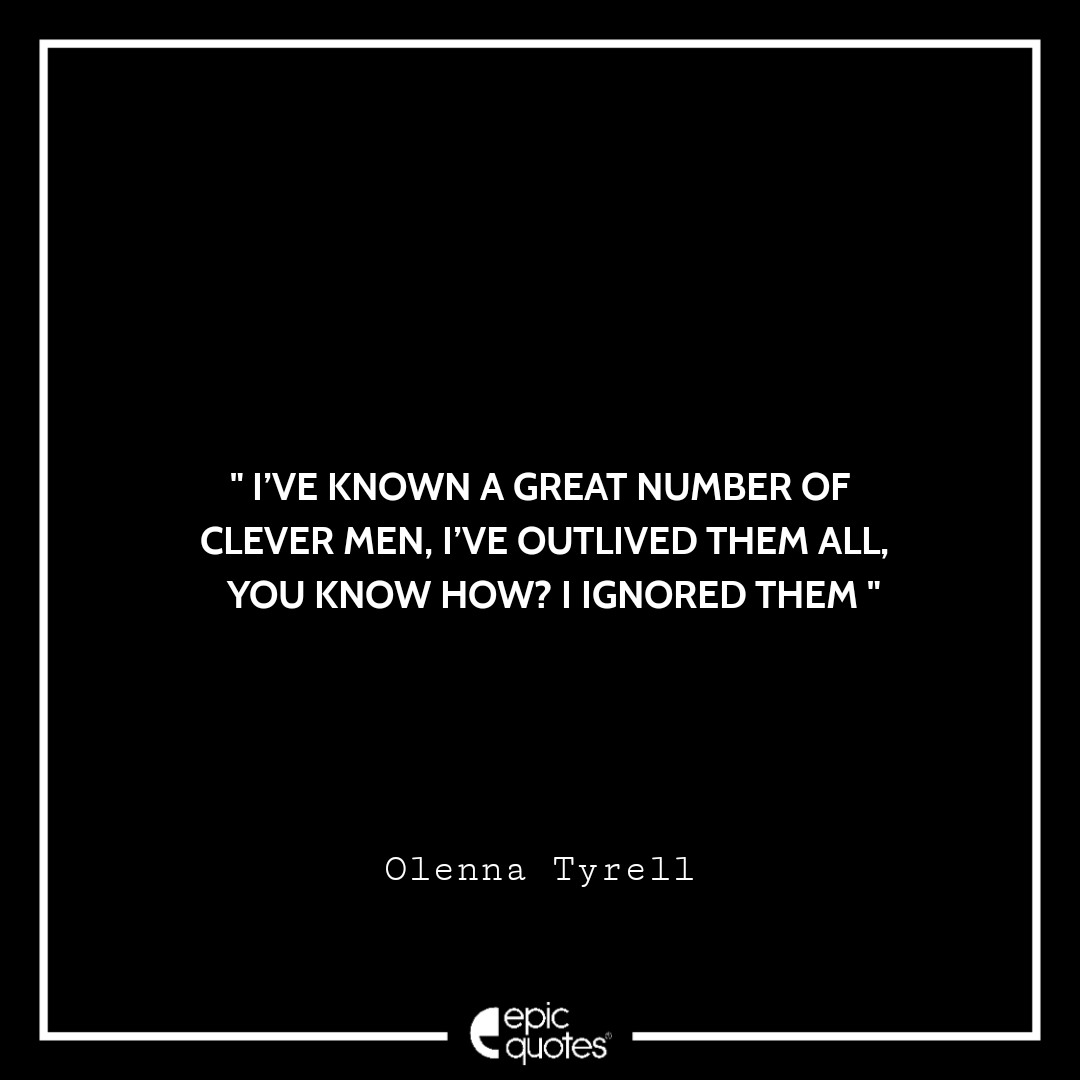 Categories Game of ThronesI’ve known a great number of clever men, I’ve outlived them all, you know how? I ignored them. -Olenna Tyrell Post author By Shubham Post date October 28, 2020 I’ve known a great number of clever men, I’ve outlived them all, you know how? I ignored them. -Olenna Tyrell” I’ve known a great number of clever men, I’ve outlived them all, you know how? I ignored them. -Olenna Tyrell “ Lets be social: 1.4M+ Fans 450K+ Followers ← I know the walls have ears, but apparently the shrubbery does too. -Olenna Tyrell → Tell Cersei, I want her to know it was me -Olenna Tyrell Related articles I congratulate you upon your restraint. -Olenna Tyrell Tell Cersei, I want her to know it was me -Olenna Tyrell I know the walls have ears, but apparently the shrubbery does too. -Olenna Tyrell Be a dragon. -Olenna Tyrell Spare me the homilies, I can smell a fraud from a mile away. -Olenna Tyrell Don’t presume to tell me what I need. -Olenna Tyrell