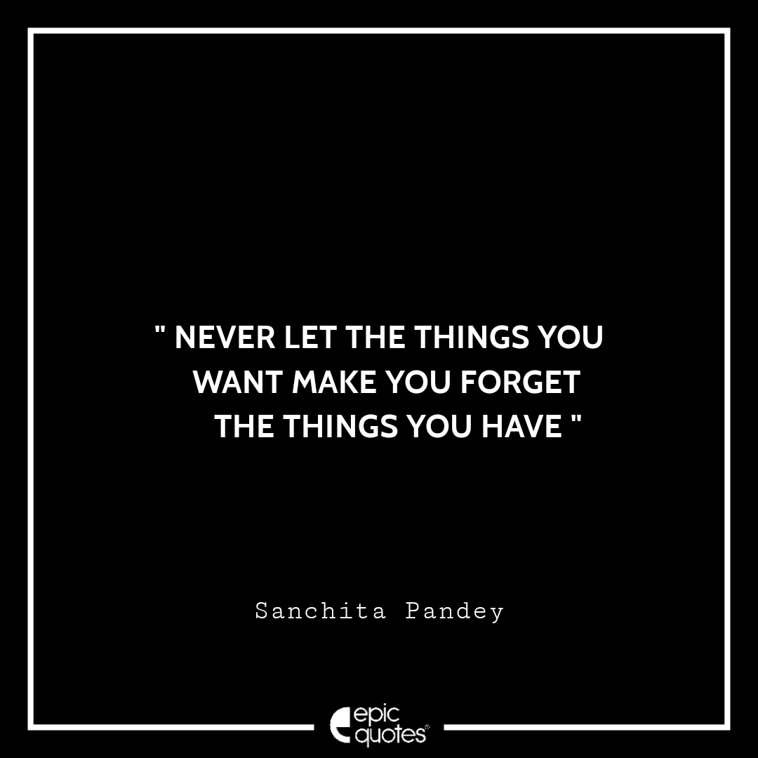 Categories InspirationalNever let the things you want make you forget the things you have – Sanchita Pandey Post author By Frady Lal Post date August 5, 2020 never let the things you want make you forget the things you have” Never let the things you want make you forget the things you have – Sanchita Pandey “ Lets be social: 1.4M+ Fans 450K+ Followers ← There is nothing better than true love in the whole world except a nice MLT: Mutton, lettuce, and tomato. -Miracle Max the Wizard → By God, when you see your beauty you will be the idol of yourself. -Rumi Related articles All progress takes place outside the comfort zone Do one thing every day that scares you The ones who are crazy enough to think they can change the world, are the ones that do If you are not willing to risk the usual, you will have to settle for the ordinary I owe my success to having listened respectfully to the very best advice, and then going away and doing the exact opposite Success is walking from failure to failure with no loss of enthusiasm