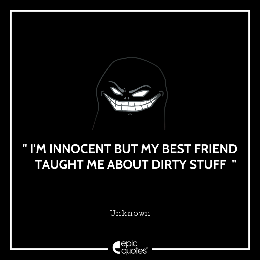 I'm innocent but my best friend Taught me about dirty stuff Categories Epic Quotes Main Friends " I’m innocent but my best friend Taught me about dirty stuff " Post author By Sanjay Dubey Post date November 9, 2021 Tags Best Friend Quotes, Epic Quotes, Friendship Quotes, Inspiring, Life Quotes, quotes