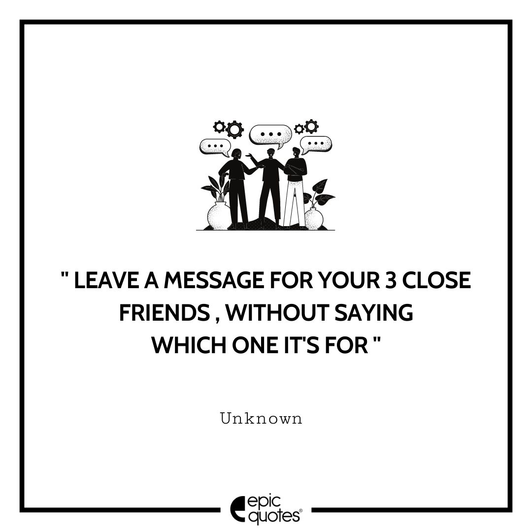 Leave a message FOR YOUR 3 close FRIENDS , without saying which one it's for. Categories Epic Quotes Main Friendship " Leave a message FOR YOUR 3 close FRIENDS , without saying which one it’s for. " Post author By Sanjay Dubey Post date November 22, 2021 Tags Epic Quotes, Funny Quotes, Inspiring, Life Quotes, Love Quotes, quotes