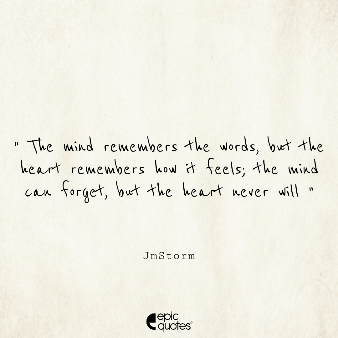 Categories LoveThe mind remembers the words, but the heart remembers how it feels, the mind can forget but the heart never will Post author By Chirag Malik Post date March 7, 2020 The mind remembers the words, but the heart remembers how it feels, the mind can forget but the heart never will” The mind remembers the words, but the heart remembers how it feels, the mind can forget but the heart never will “ Lets be social: 1.4M+ Fans 450K+ Followers Tags Epic life quotes, epic quotes on love, Love Quotes Chirag MalikMeet Mr Sarcasm, always giving advice – taking none, a wannabe engineer and a bonafide curator who’s full of quirks! Ps : No one really listens to him though ;)Connect with me:[email protected] View Posts → ← I’m that person who sticks around longer than i should, but when I’m gone, I’m gone → Done is better than perfect Related articles Love is our true destiny. We do not find the meaning of life by ourselves alone – we find it with another. Thomas Merton People call it Valentine’s Day, I’ll call it Monday – Unknown Kiss me If I’m Wrong But Dinosaurs Still Exist Right? – Unknown Sorry if I left you on read, I didn’t mean to open it Its easy to fall in love, climbing back up, not so much Imagine someone thinking of you and buying Nutella.