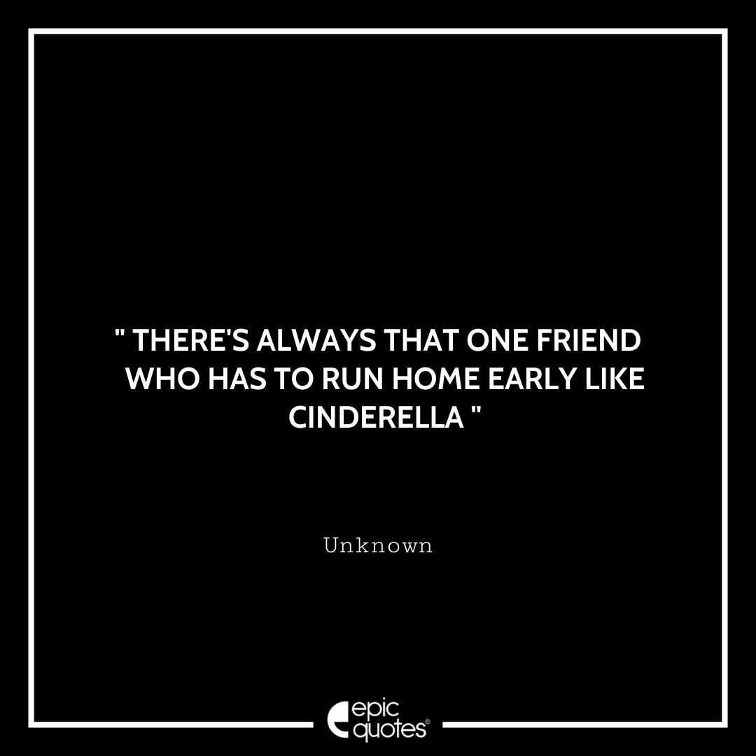 Categories Epic Quotes MainThere’s always that one friend who has to run home early like Cinderella Post author By Tanya Suyal Post date April 17, 2022 There's always that one friend who has to run home early like Cinderella” There’s always that one friend who has to run home early like Cinderella “ Lets be social: 1.4M+ Fans 450K+ Followers Tags Epic Quotes, Funny Quotes, Inspiring, Life, Life Quotes, quotes ← 10 Memorable Fantastic Beasts: The Secrets of Dumbledore Quotes → 10 Most Memorable Quotes By Baseball Legend Jackie Robinson Related articles Sorry I’m Late, I was Hoping the Plan Would be Canceled Don’t cry over what has happened; great things are ahead Kindle, paperbacks, or do you not read at all? Is it just me or does everyone have a second dinner? What’s your first thought every morning after waking up? I miss my lost friendships more than anything else
