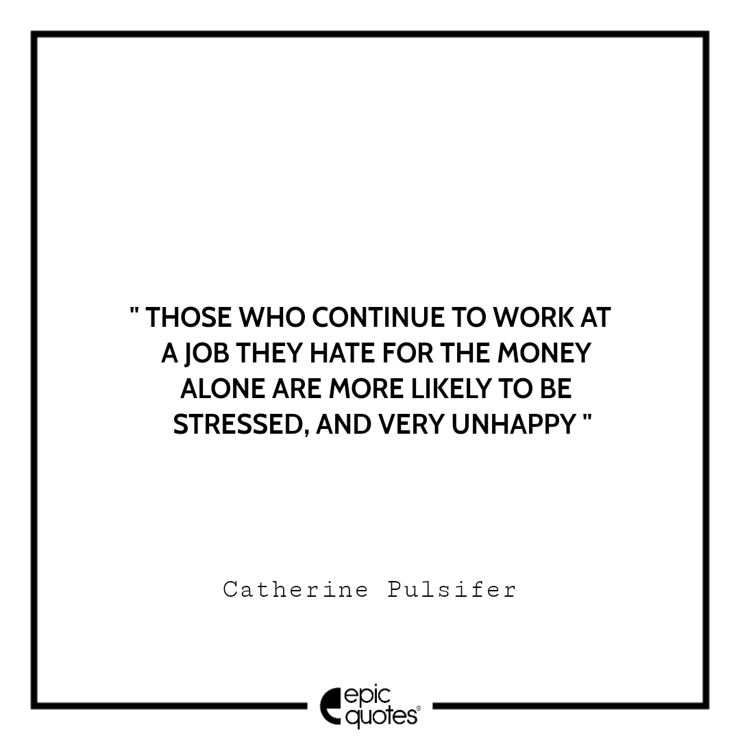 Categories SaturdayThose who continue to work at a job they hate for the money alone are more likely to be stressed, and very unhappy. -Catherine Pulsifer Post author By Shubham Post date April 1, 2022 Those who continue to work at a job they hate for the money alone are more likely to be stressed, and very unhappy. -Catherine Pulsifer” Those who continue to work at a job they hate for the money alone are more likely to be stressed, and very unhappy. -Catherine Pulsifer “ Lets be social: 1.4M+ Fans 450K+ Followers ← All progress takes place outside the comfort zone → Being in love is what makes working all week bearable. -Julie Hintz Related articles Life doesn’t require that we be the best, only that we try our best. -H. Jackson Brown Jr. The more you praise and celebrate your life, the more there is in life to celebrate. -Oprah Winfrey Find ecstasy in life; the mere sense of living is joy enough. -Emily Dickinson All of life is peaks and valleys, don’t let the peaks get too high and the valleys too low. -John Wooden If life were predictable it would cease to be life, and be without flavor. —Eleanor Roosevelt A man who dares to waste one hour of time has not discovered the value of life. -Charles Darwin