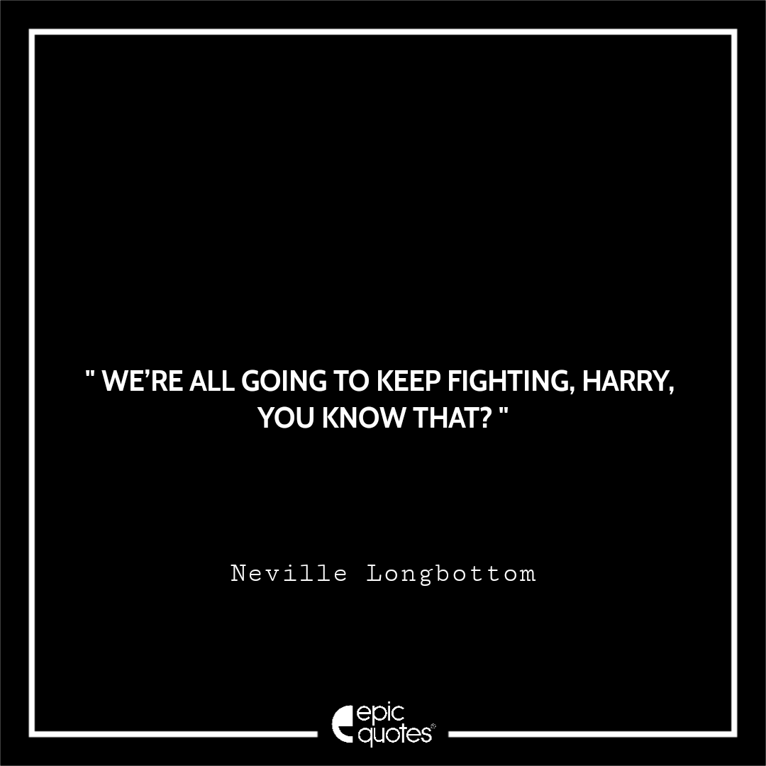 Categories Harry PotterWe’re all going to keep fighting, Harry. You know that? Post author By Shubham Post date April 1, 2022 We’re all going to keep fighting, Harry. You know that?” We’re all going to keep fighting, Harry. You know that? “ Lets be social: 1.4M+ Fans 450K+ Followers ← Happiness doesn’t depend on any external conditions, it is governed by our mental attitude. -Dale Carnegie → And now, Harry, let us step out into the night and pursue that flighty temptress, adventure Related articles Always the tone of surprise Actually I’m highly logical which allows me to look past extraneous detail and perceive clearly that which others overlook I mean, you could claim that anything’s real if the only basis for believing in it is that nobody’s proved it doesn’t exist! I’m hoping to do some good in the world! Dumbledore watched her fly away, and as her silvery glow faded he turned back to Snape, and his eyes were full of tears…..“After all this time? Words are, in my not so humble opinion, our most inexhaustible source of magic, capable of both influencing injury, and remedying it
