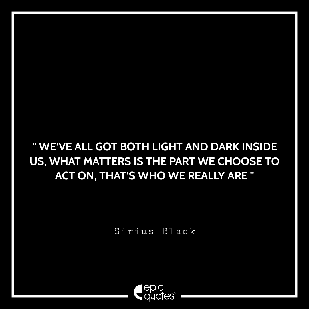 Categories Harry PotterWe’ve all got both light and dark inside us. What matters is the part we choose to act on. That’s who we really are Post author By Shubham Post date April 1, 2022 We’ve all got both light and dark inside us. What matters is the part we choose to act on. That’s who we really are” We’ve all got both light and dark inside us. What matters is the part we choose to act on. That’s who we really are “ Lets be social: 1.4M+ Fans 450K+ Followers ← Things we lose have a way of coming back to us in the end, if not always in the way we expect → It matters not what someone is born, but what they grow to be Related articles Always the tone of surprise Actually I’m highly logical which allows me to look past extraneous detail and perceive clearly that which others overlook I mean, you could claim that anything’s real if the only basis for believing in it is that nobody’s proved it doesn’t exist! I’m hoping to do some good in the world! Dumbledore watched her fly away, and as her silvery glow faded he turned back to Snape, and his eyes were full of tears…..“After all this time? Words are, in my not so humble opinion, our most inexhaustible source of magic, capable of both influencing injury, and remedying it