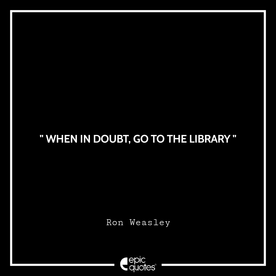 Categories Harry PotterWhen in doubt, go to the library Post author By Shubham Post date April 1, 2022 When in doubt, go to the library - Ron” When in doubt, go to the library “ Lets be social: 1.4M+ Fans 450K+ Followers ← Hearing voices no one else can hear isn’t a good sign, even in the wizarding world → Of all the trees we could’ve hit, we had to get one that hits back Related articles Always the tone of surprise Actually I’m highly logical which allows me to look past extraneous detail and perceive clearly that which others overlook I mean, you could claim that anything’s real if the only basis for believing in it is that nobody’s proved it doesn’t exist! I’m hoping to do some good in the world! Dumbledore watched her fly away, and as her silvery glow faded he turned back to Snape, and his eyes were full of tears…..“After all this time? Words are, in my not so humble opinion, our most inexhaustible source of magic, capable of both influencing injury, and remedying it