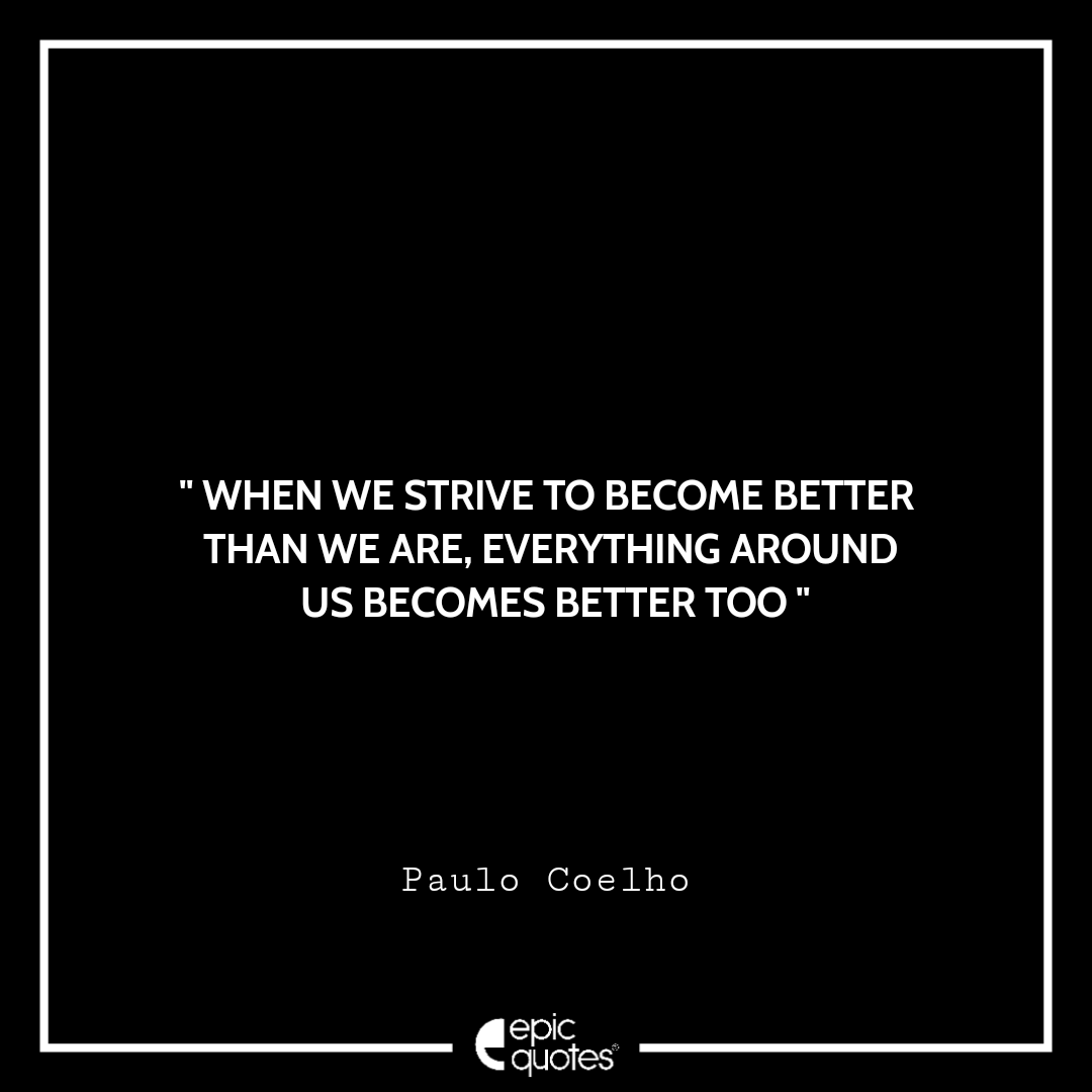 Categories ThursdayWhen we strive to become better than we are, everything around us becomes better too. Paulo Coelho Post author By Shubham Post date October 28, 2020 When we strive to become better than we are, everything around us becomes better too. Paulo Coelho” When we strive to become better than we are, everything around us becomes better too. Paulo Coelho “ Lets be social: 1.4M+ Fans 450K+ Followers ← I’m a greater believer in luck, and I find the harder I work the more I have of it. Thomas Jefferson → Opportunity is missed by most people because it is dressed in overalls and looks like work. Thomas Edison Related articles Life is about making an impact, not making an income. -Kevin Kruse The miracle is not that we do this work, but that we are happy to do it. –Mother Teresa If something is important enough, even if the odds are stacked against you, you should still do it. –Elon Musk Your passion is waiting for your courage to catch up. –Isabelle Lafleche Whatever you are, be a good one. -Abraham Lincoln The only person you should try to be better than, is the person you were yesterday. -Unknown