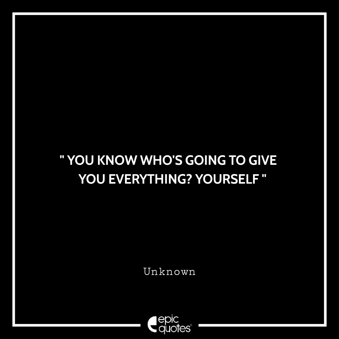 Categories InspirationalYou know who’s going to give you everything? Yourself Post author By Shubham Post date January 29, 2021 You know who's going to give you everything? Yourself” You know who’s going to give you everything? Yourself “ Lets be social: 1.4M+ Fans 450K+ Followers ← Sometimes only paper will listen to you → Your background and environment is with you for life, No question about that. -Sean Connery Related articles All progress takes place outside the comfort zone Do one thing every day that scares you The ones who are crazy enough to think they can change the world, are the ones that do If you are not willing to risk the usual, you will have to settle for the ordinary I owe my success to having listened respectfully to the very best advice, and then going away and doing the exact opposite Success is walking from failure to failure with no loss of enthusiasm